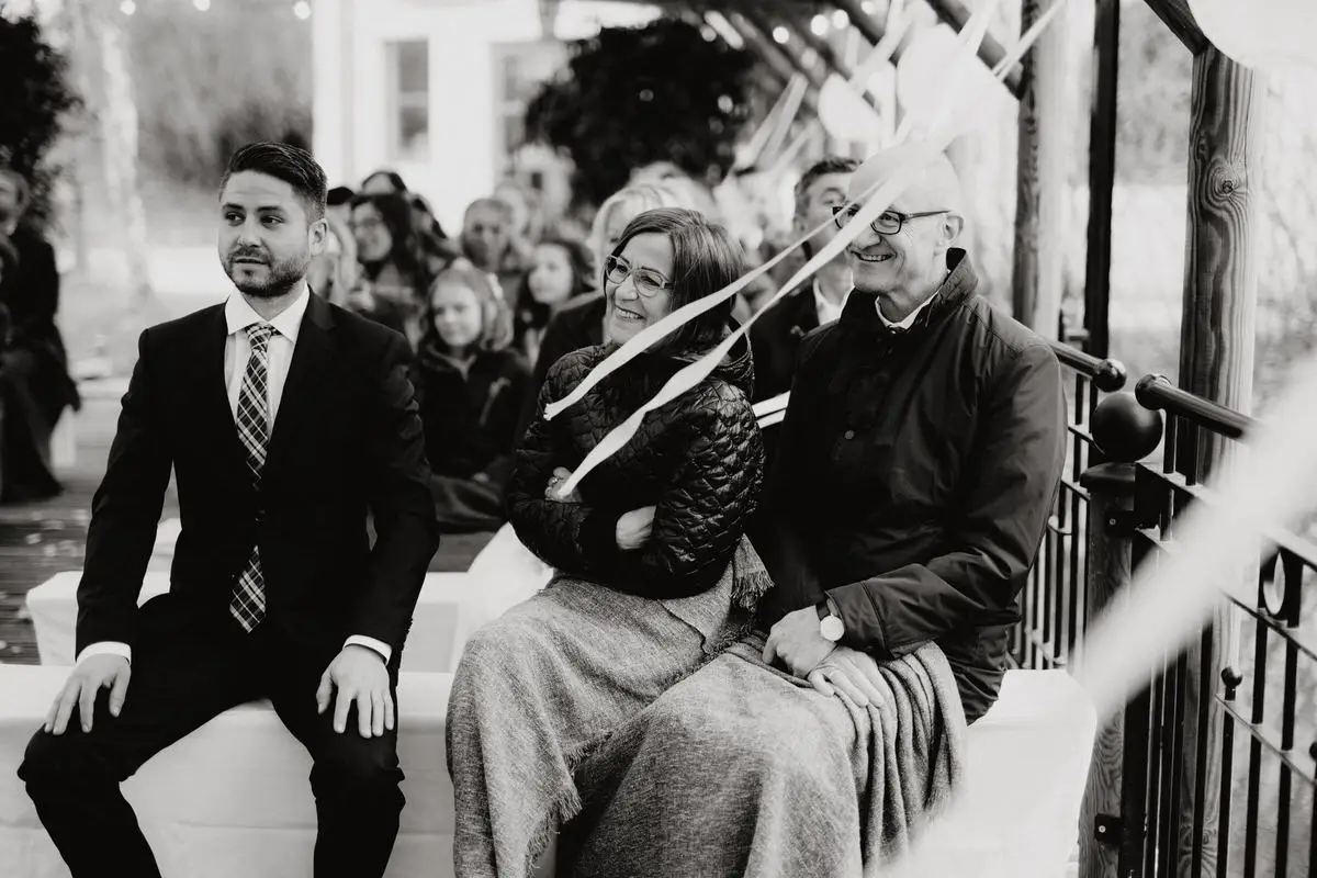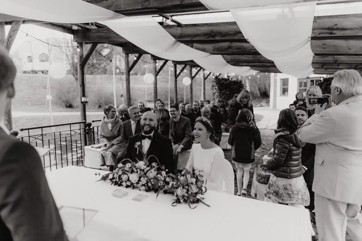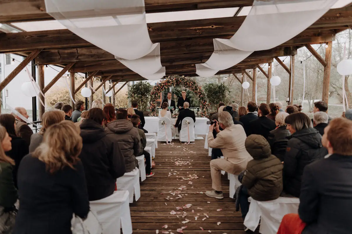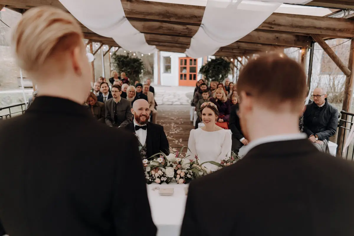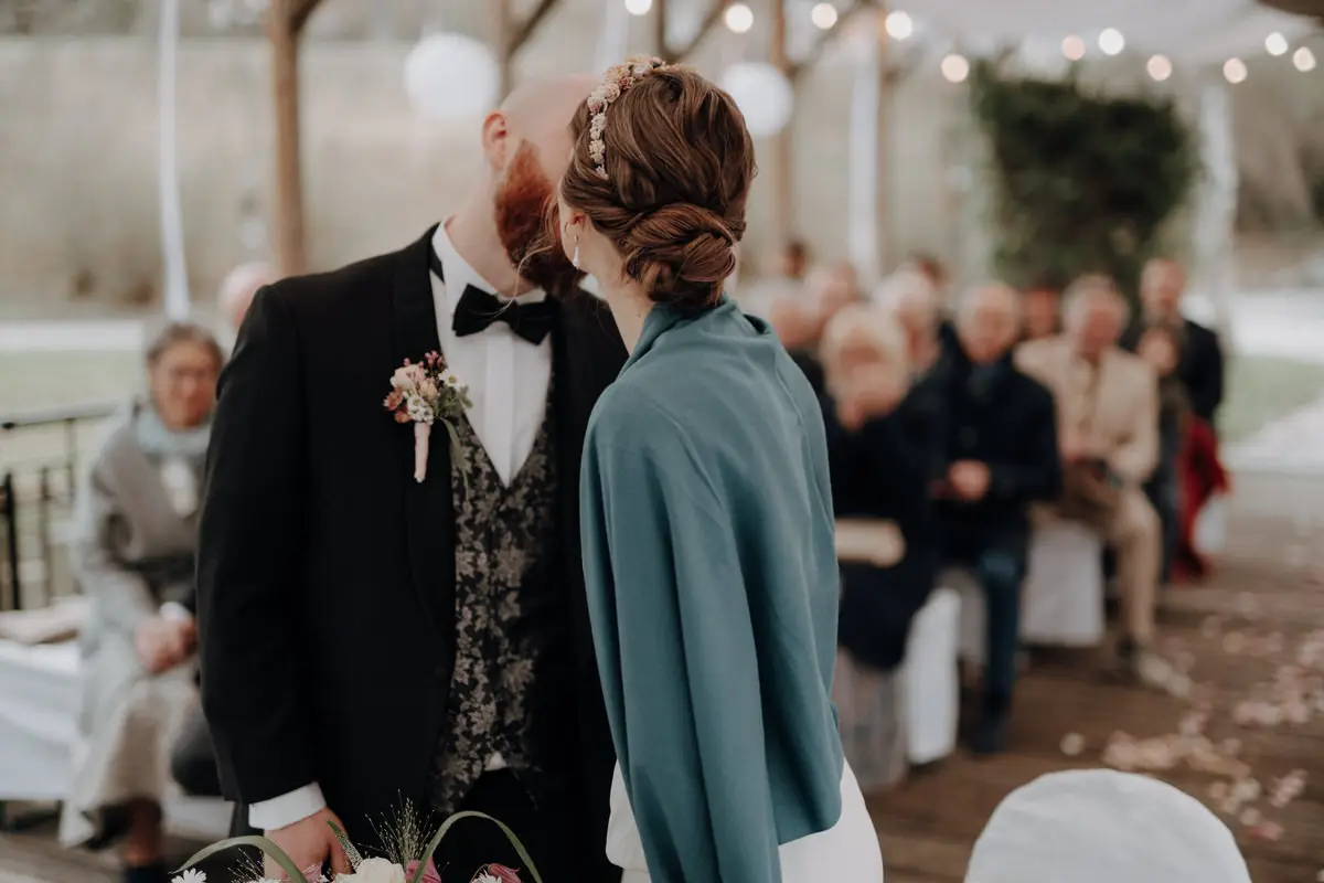 Während der Trauung halte ich bewusst Abstand. Nicht aus Zurückhaltung, sondern aus Respekt. Ihr sollt euch auf euch konzentrieren können, auf das, was gerade passiert. Ich suche mir klare Perspektiven, arbeite mit natürlichen Blickachsen und achte auf Details, die oft nur Sekunden dauern: ein Händedruck, ein Lächeln, ein tiefer Atemzug vor dem Ja-Wort.