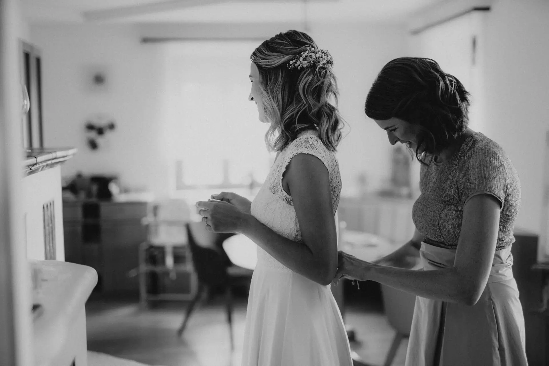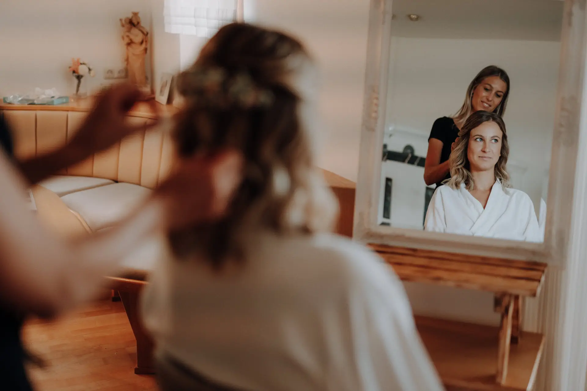 Schon beim Getting Ready wurde klar, wie wichtig Katja und Philip eine ruhige Atmosphäre war. Keine Hektik, kein Zeitdruck, sondern Raum für Vorbereitung, Nähe und Vorfreude. Katja wurde von ihrer Schwester unterstützt, es gab leise Gespräche, konzentrierte Blicke in den Spiegel und diese besondere Stimmung kurz bevor ein Hochzeitstag beginnt. Für mich sind das oft die ehrlichsten Momente – still, persönlich und voller Bedeutung.