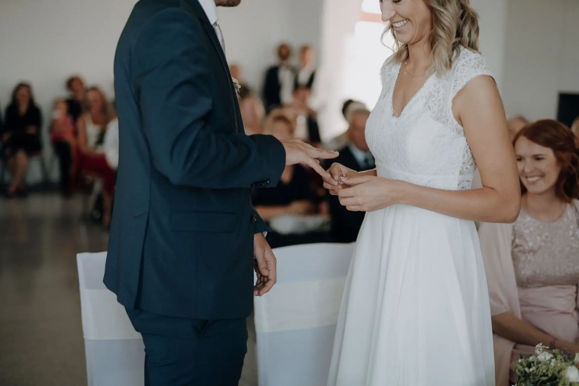 Während der Trauung entstanden viele kleine Details: Hände, die sich finden. Der Ring, der weitergereicht wird. Ein Lächeln, ein kurzer Blick. Katja und Philip waren ganz bei sich – und genau das macht diese Hochzeitsfotos so ehrlich. Ich glaube fest daran, dass authentische Hochzeitsfotografie dann entsteht, wenn Paare sich nicht mit der Kamera beschäftigen müssen.
