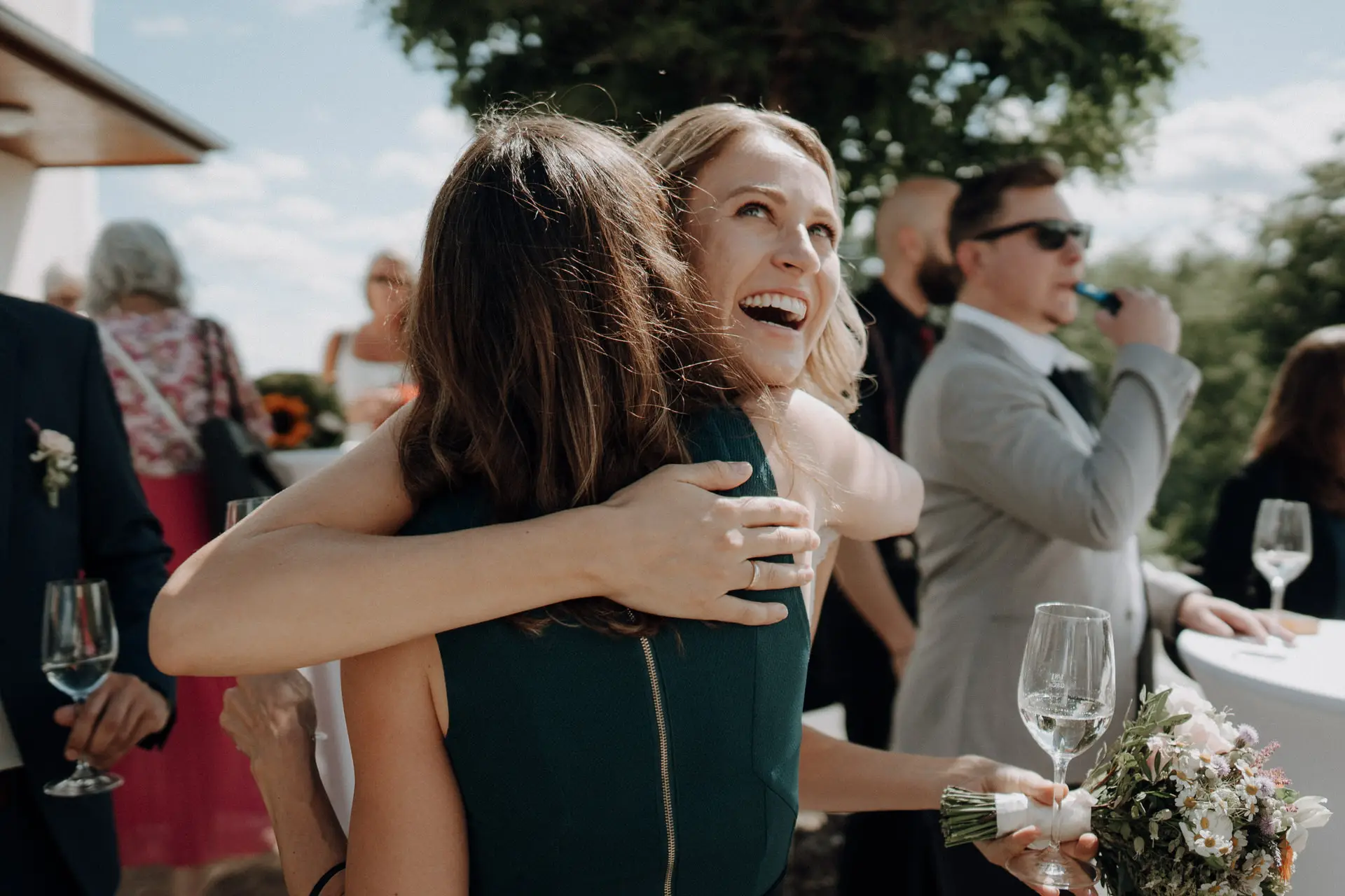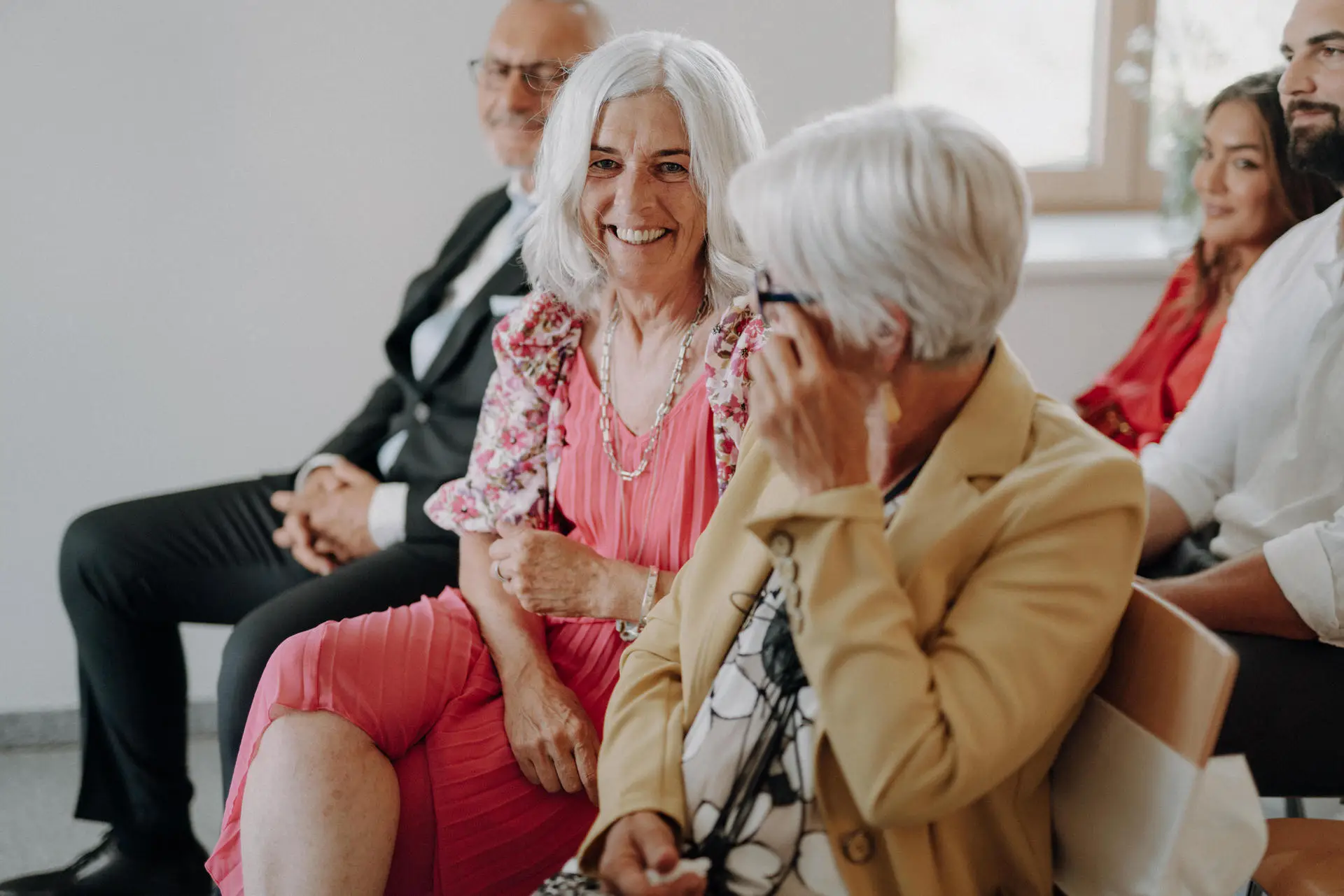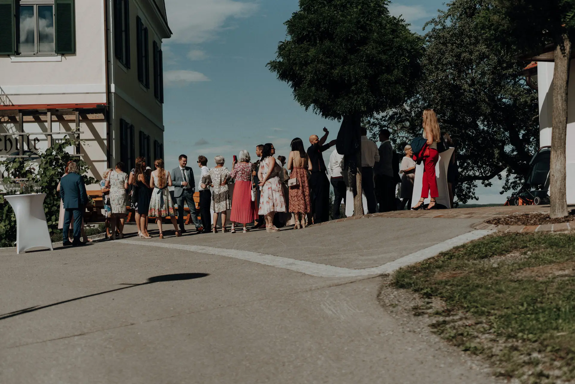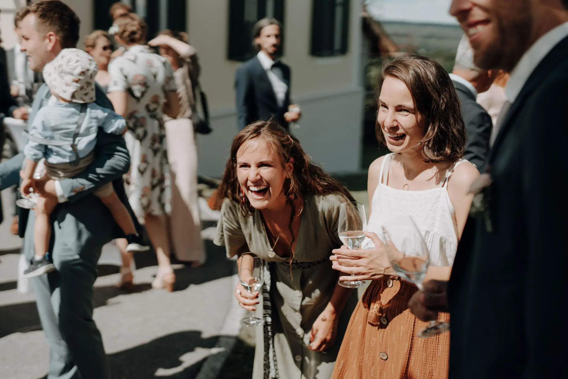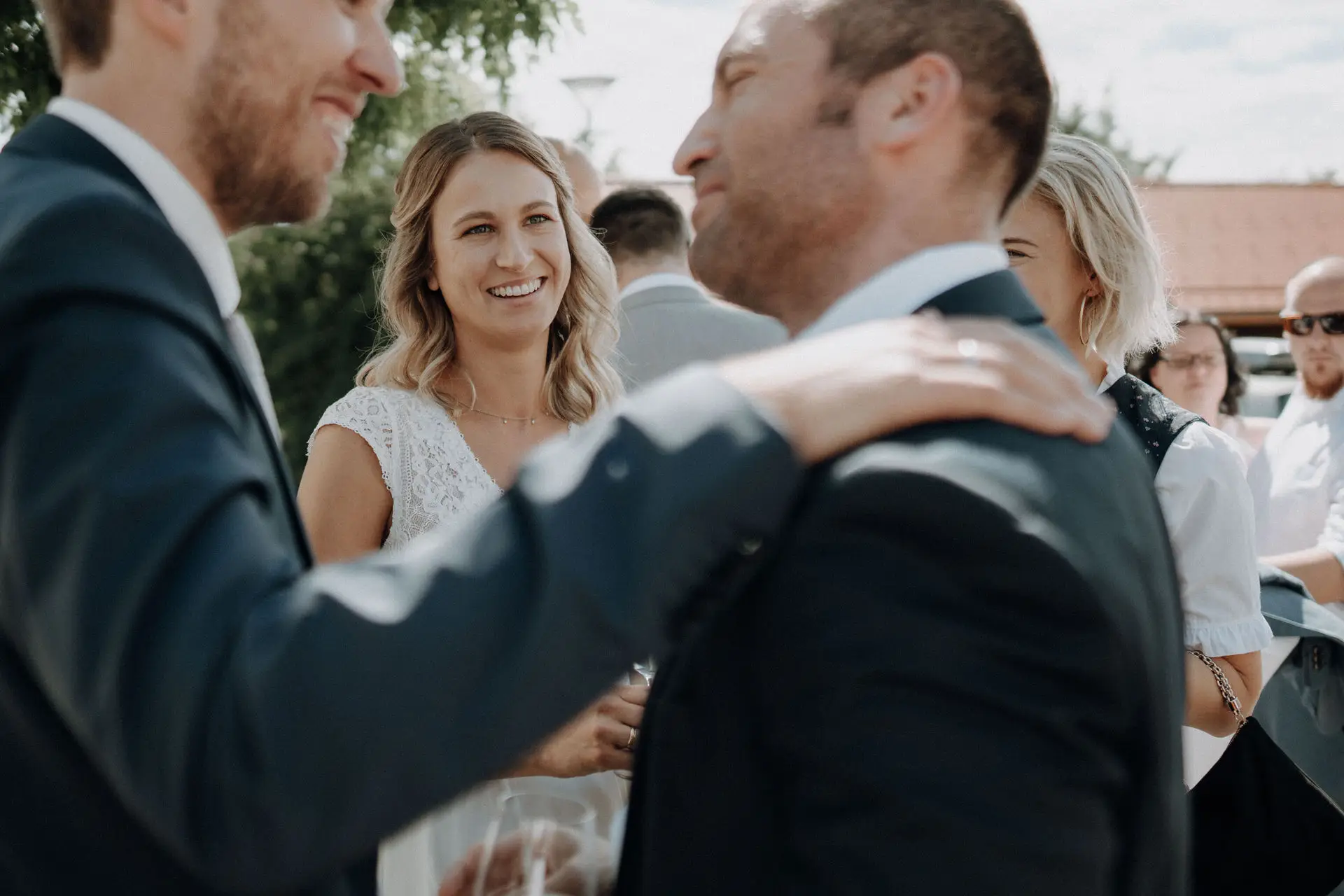 Nach dem Ja-Wort und dem Hochzeitskuss löste sich die Stimmung. Bei der Agape wurde gratuliert, gelacht und gesprochen. Gäste kamen zusammen, Gespräche entstanden, der Tag begann zu fließen. Auch hier arbeite ich ruhig und unaufdringlich, bewege mich zwischen den Menschen und halte fest, was von selbst passiert.