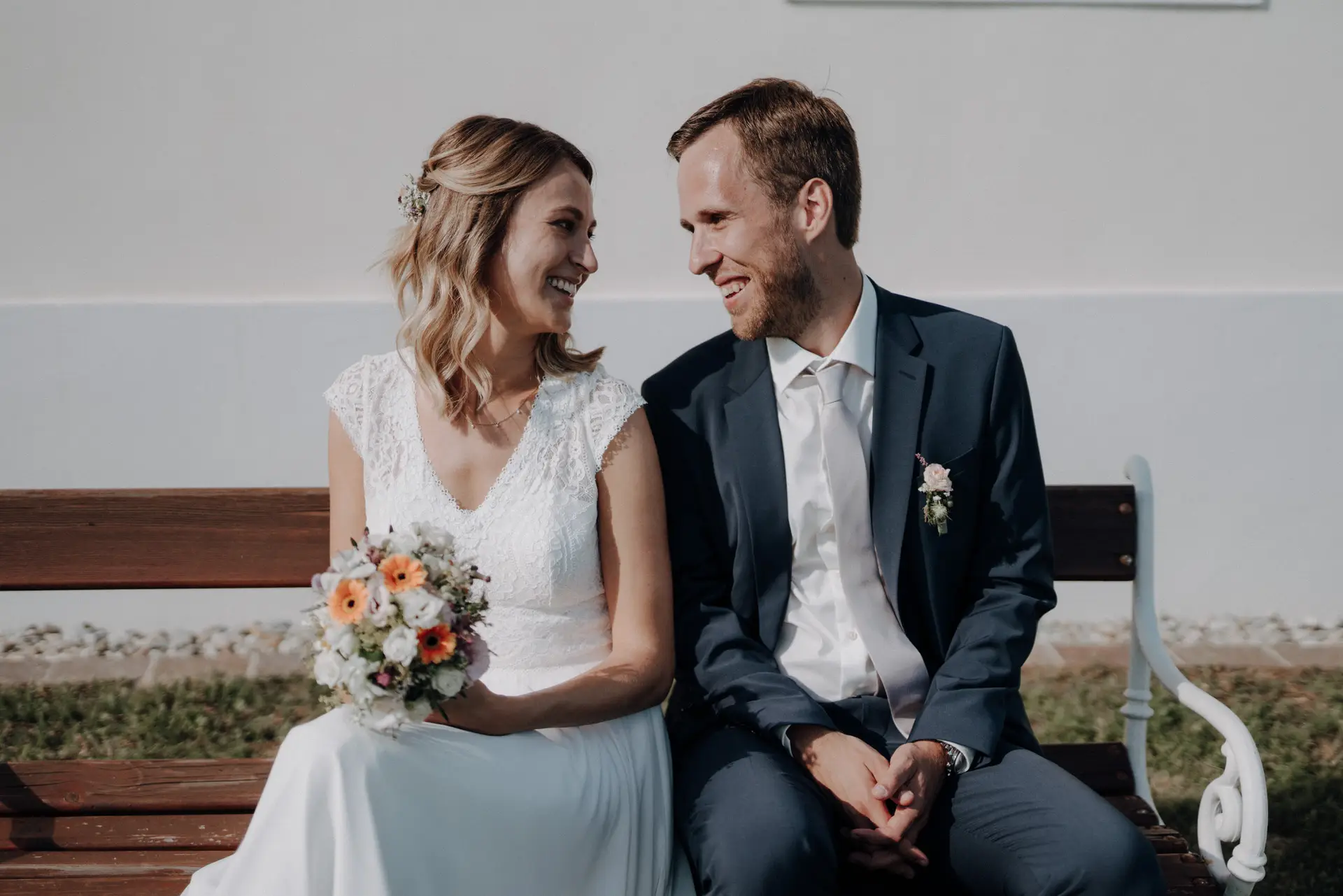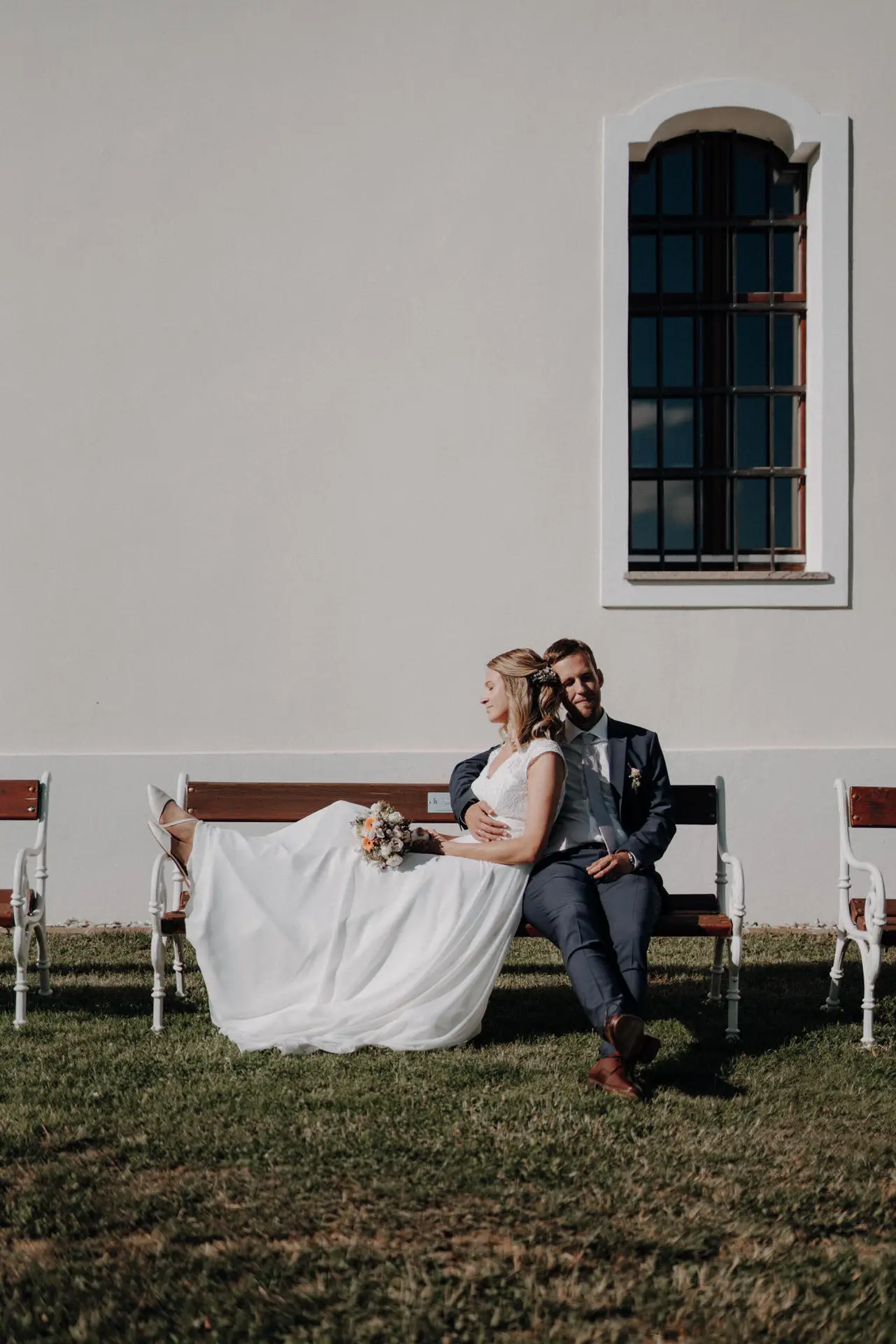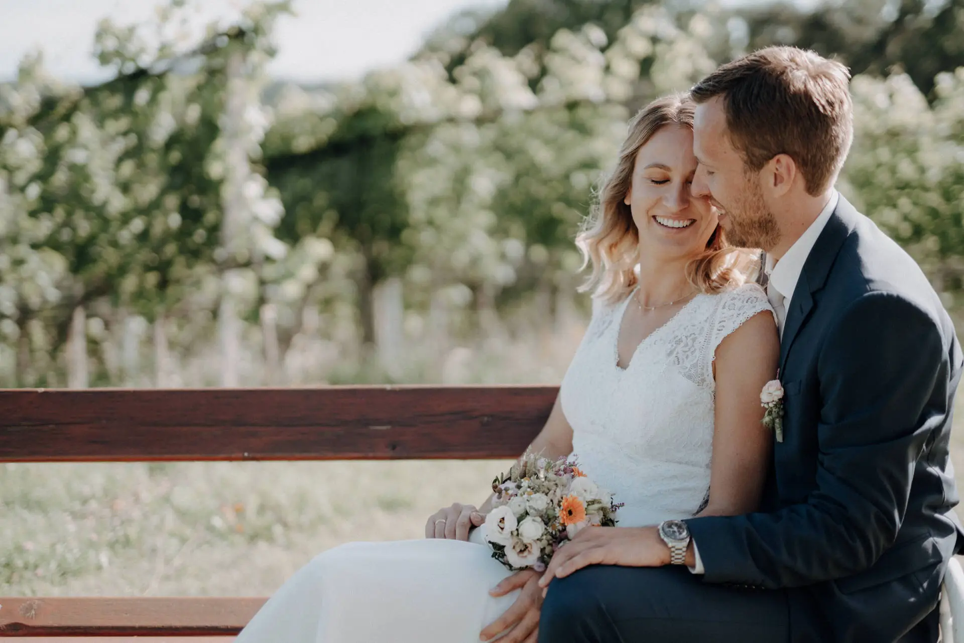 Für die Paarfotos haben wir uns bewusst Zeit genommen. Kein fixes Programm, kein Druck. Katja und Philip gingen gemeinsam durch das Grün, setzten sich auf eine Bank, lachten, kuschelten, hielten Händchen. Diese Momente entstehen nicht durch Anweisungen, sondern durch Vertrauen und Ruhe.